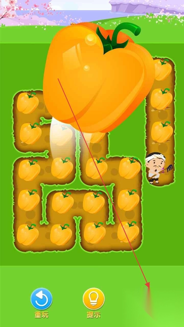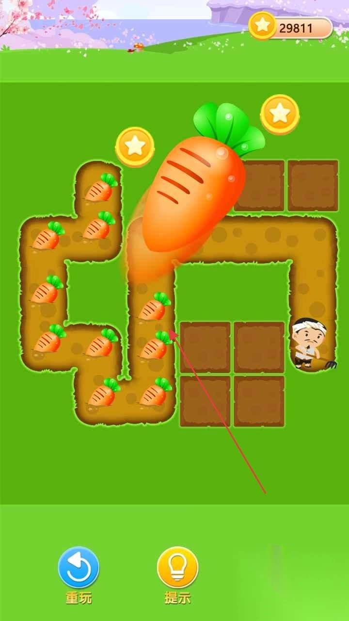 1、在萝卜关卡,操控农民,沿箭头路径,规划路线,收集萝卜,避开障碍,完成关卡。