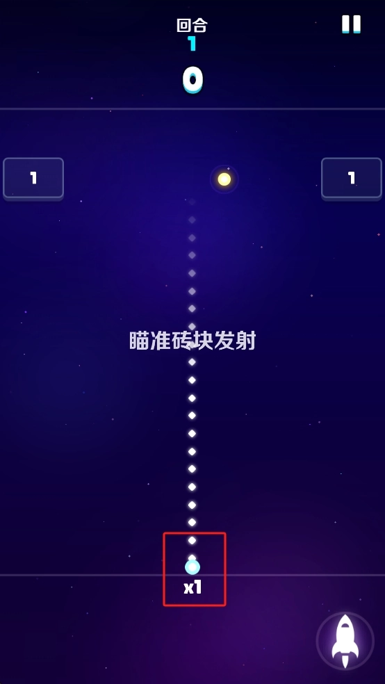 1. 第一步,我们拖动底部的蓝色小球,使其瞄准上方的砖块,同时调整发射角度,接着点击右下角的火箭图标进行发射,依靠弹道来击碎砖块。