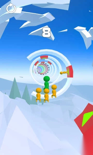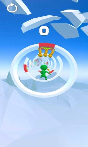 2、实时视觉反馈:成功连续跳跃5次激活「连击光效」,圆环边缘出现彩色流光,收集满10个小人后解锁「彩虹轨迹」,增强操作成就感。