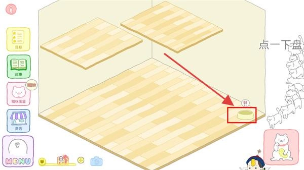 1、首先大家进入猫咪很可爱可我是幽灵游戏,刚进入游戏我们可以看到有一个猫盆,点击一下就可以装上猫粮了。
