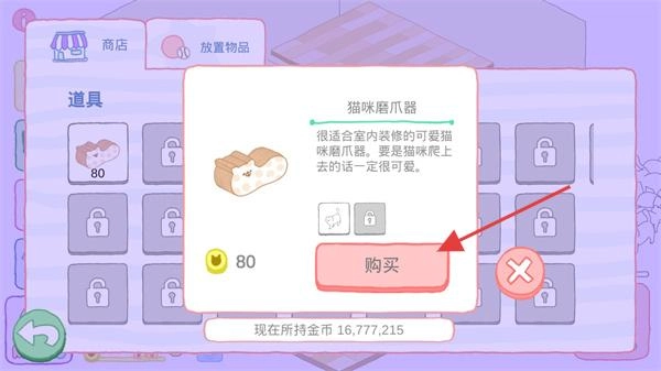 3、进入商店“道具”栏,找到“猫咪磨爪器”,花费80金币点击“购买”,将其放置到室内,吸引猫咪使用,增添趣味互动。