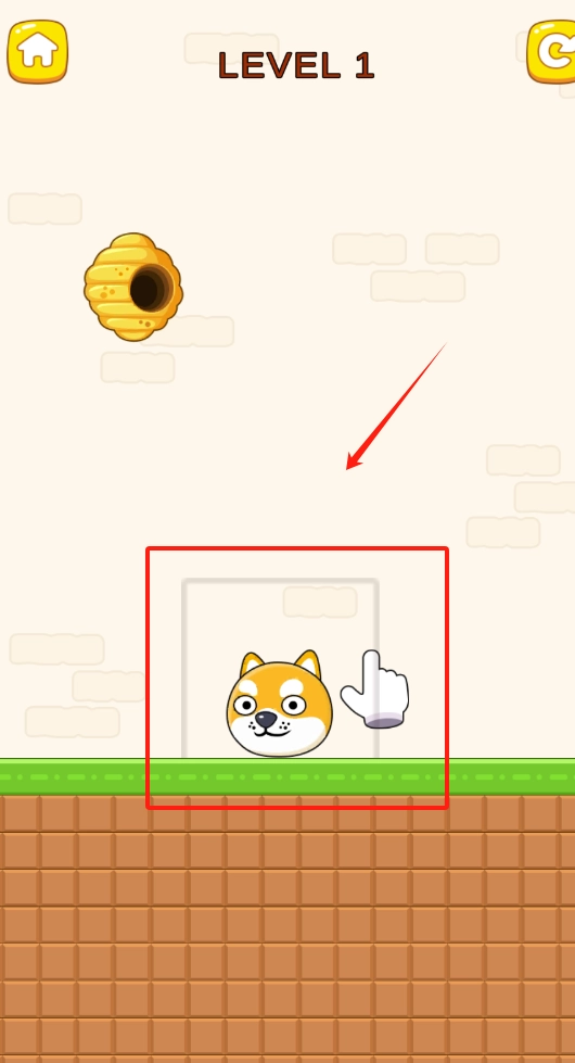2、进入第一关后,点击柴犬头像旁边的红色箭头,帮助柴犬脱离危险,注意躲避上方蜂巢掉落的蜜蜂。