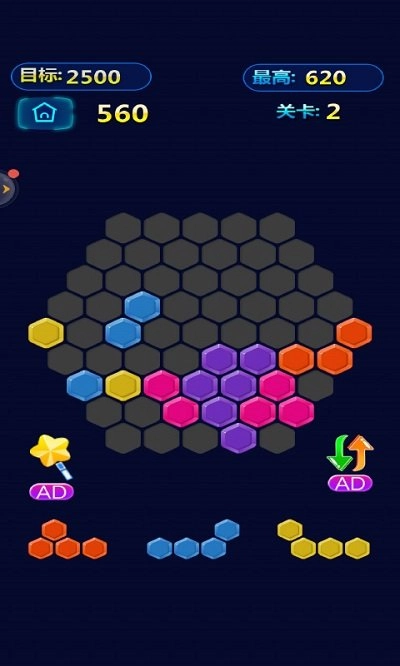 2、动态棋盘设计:500+个手工设计的特色关卡,每个关卡都有独特的六边形布局和障碍设置。棋盘会随消除进度产生动态变化,保持游戏新鲜感。