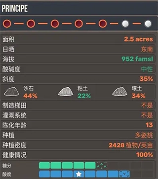 葡萄的生长会受到土地特性的影响。最初种植时的选址,对葡萄品种的品质起着决定性作用。土地特性主要涵盖海拔高度、土壤酸碱度以及土壤成分(包括砂土、黏土、壤土)。在游戏里,每块土地的游戏特性会通过三种颜色来衡量(绿色>橘色>红色)。在进行选址时,应尽可能挑选在该葡萄品种下,至少有两项呈现绿色数值的土地。