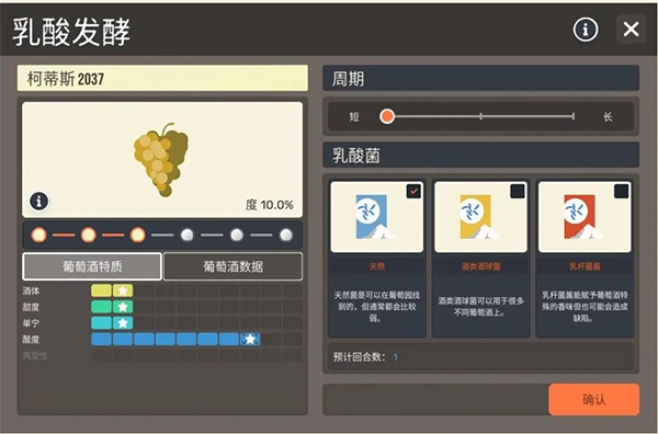 发酵:根据果汁中的含糖量,利用酵母转化成酒精。发酵周期越长需要的糖分越多,对酵母的要求酒精抗性越高,需要解锁科技。对于有甜度要求的葡萄酒,短发酵时间即可。