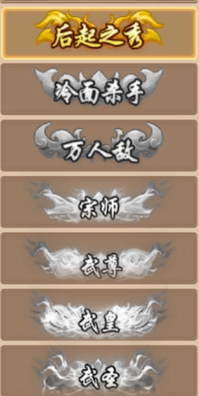 武勋称号:后起之秀,冷面杀手,万人敌,宗师,武尊,武皇,武圣