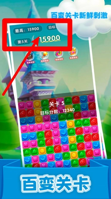 1.关卡信息区域显示当前关卡编号、目标分数及历史最高分,方便玩家随时查看通关进度与挑战目标。