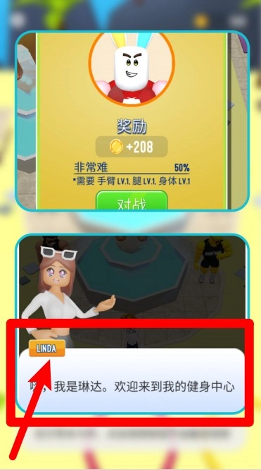 2.与健身中心的Linda互动,了解健身任务和挑战内容,开始你的健身冒险。