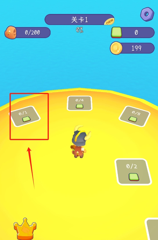 1. 点击关卡1开启游戏,当积攒到200金币时,就能够对装备进行升级,此时红框内的进度条无需理会。