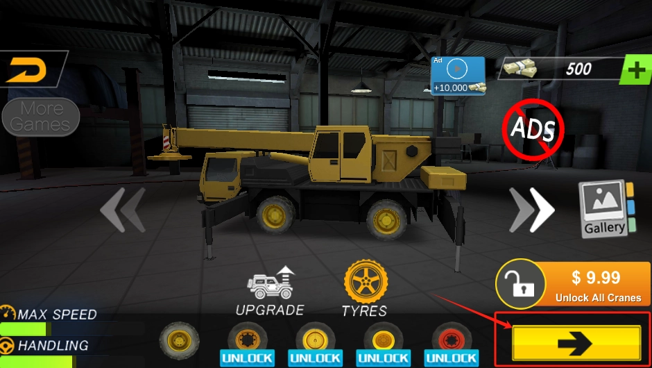 2、选黄色起重机,点右边按钮升级速度或轮胎,花9.99美元能解锁全部车辆。