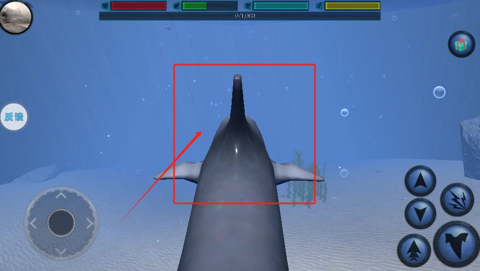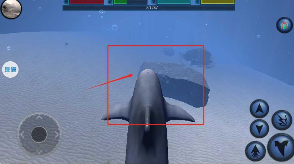 3、控制鲸鱼游动,避开礁石,用右下角按钮互动或攻击。