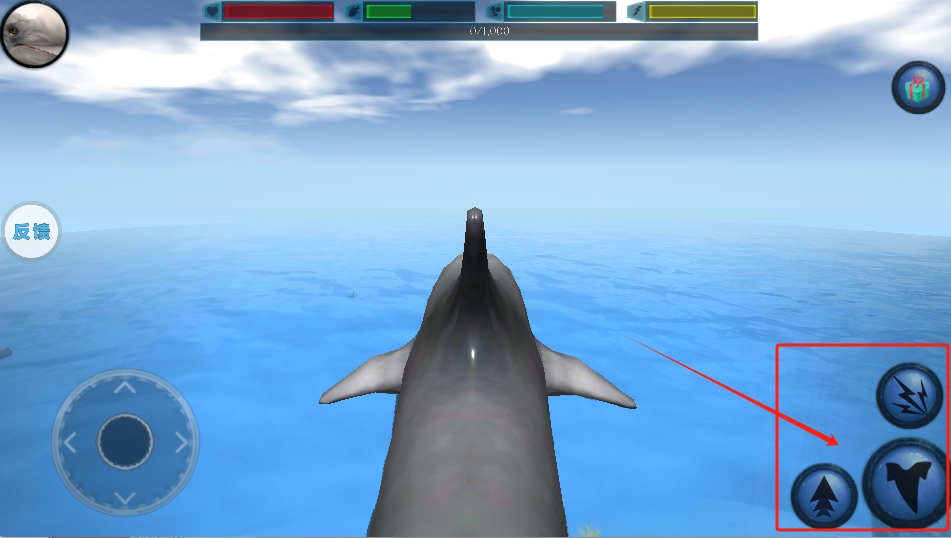 1、控制鲨鱼在水下游动,看状态条,按下面按钮攻击或放技能。