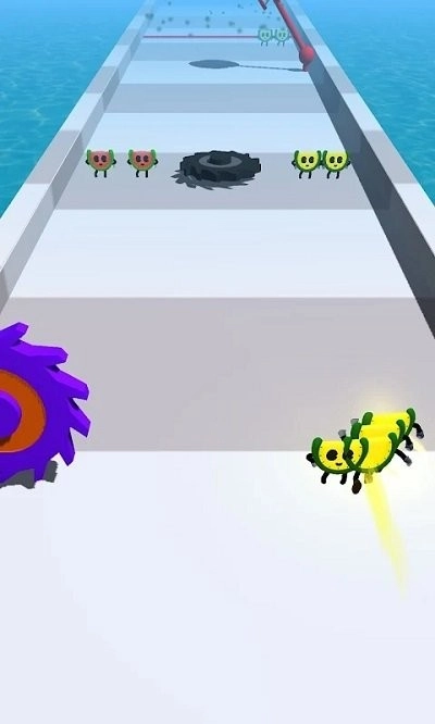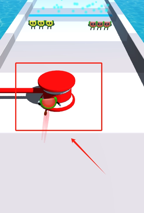 2、躲避红色装置和吃西瓜的小怪物,小心黄红两怪夹击,顺利通过赛道。
