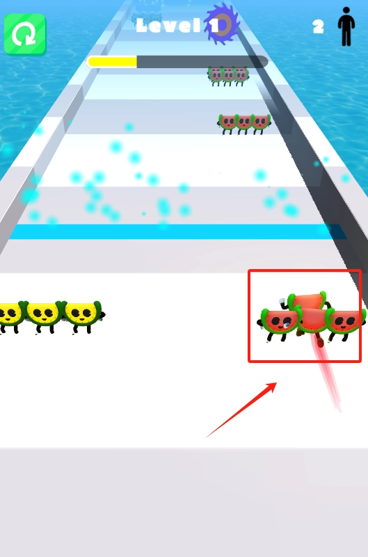 1. 在Level 1里,玩家要通过左右滑动屏幕来操控绿蓝西瓜角色前行,躲开红色障碍物以及两侧的蓝色水域。