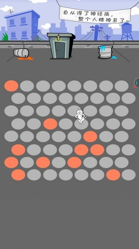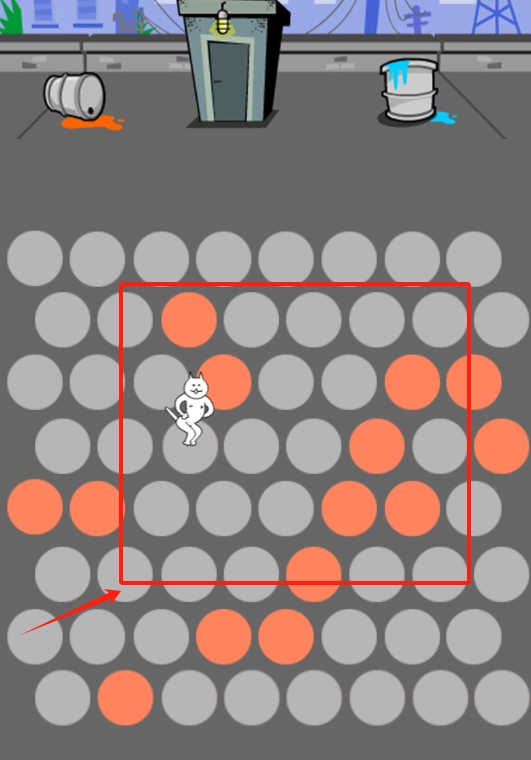 2、观察由灰橙圆点构成的地图,神经猫会在橙色圆点上奔跑移动,你需要预先堵住它的逃跑路径。