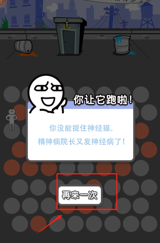 3、要是没拦住神经猫,就点红色框里的白色再来一次按钮重新挑战。