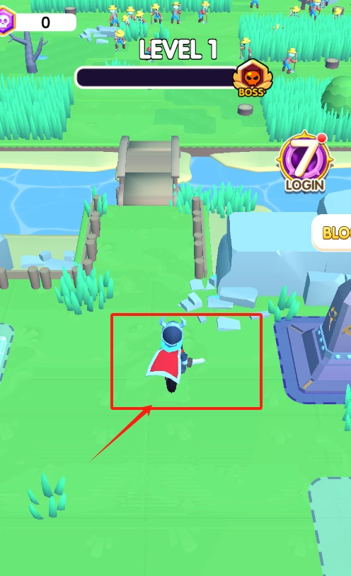 1. 瞧见红框所圈的身着红披风的小人正站在草地上,只需用手指点击屏幕的任意一处,便能操控它移动,躲开小兵进而去攻打BOSS。