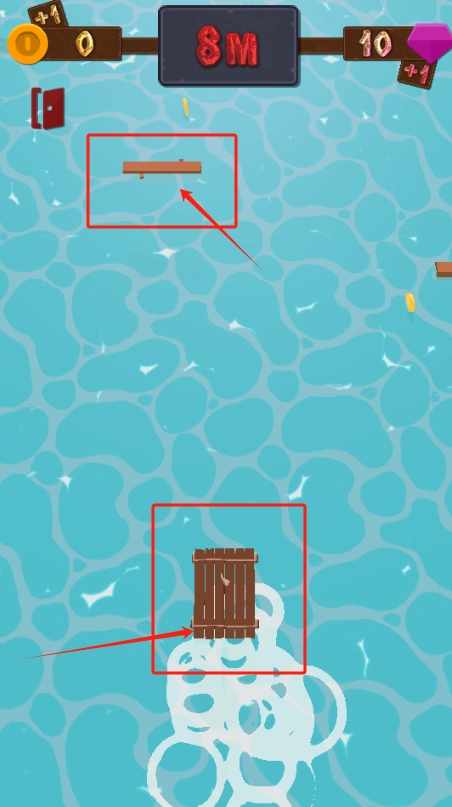2、是游戏进行中,木筏在蓝色水面上漂,上方显示得分0,距离8米,注意避开障碍物。
