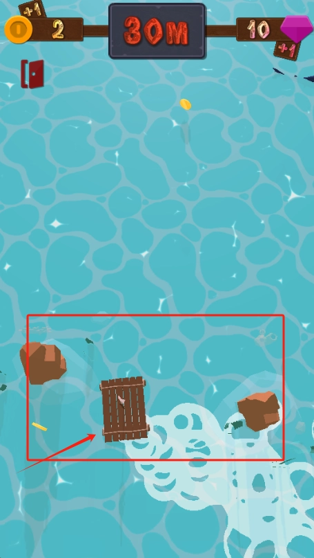 3、显示木筏漂到30米处,碰到石头得1分,当前总分2分,剩余10个紫色宝石。