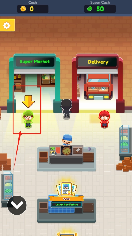 2、看绿衣小人站在超市入口,点他可以开始营业赚钱。