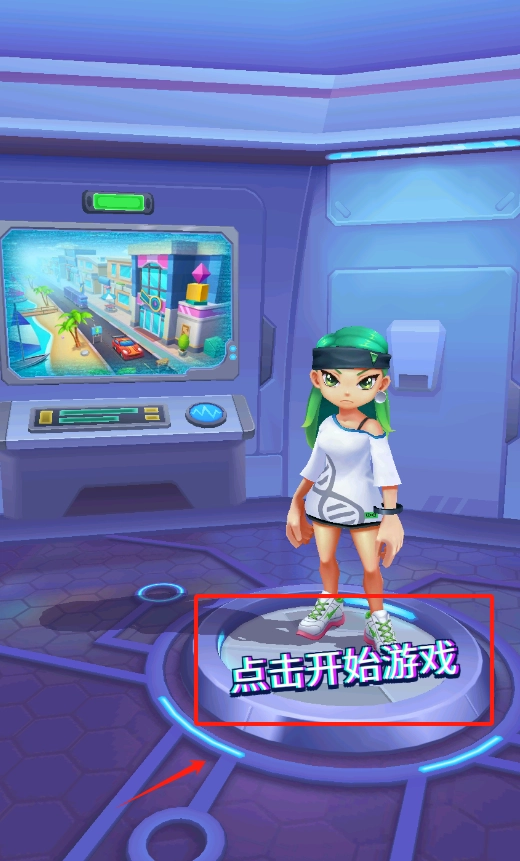1. 看到站在发光台子上的绿头发女孩了吗?点击她脚下红色框里“点击开始游戏”这几个字,就能开始玩啦。