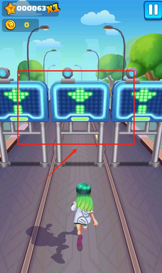 2、瞧,那个绿头发的小人正在跑道上奔跑呢。无需按下任何按钮,她就会自动往前跑,你只需盯着屏幕就好啦。