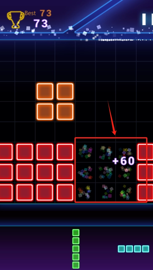 2、操控橙色方块下落拼接,消除同色方块,获取加60分奖励。