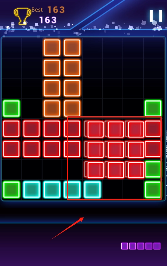 3、点击红框内的红色方块消除,凑够三个同色方块即可得分。
