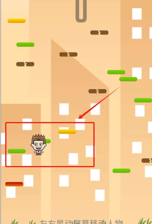3、小人立于墙面背景之前,只见上方有红色横条飘然而至,此时需左右晃动手机,使小人跃起,避开障碍,千万不能被碰到。
