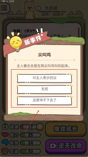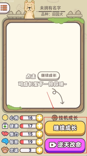 2、玩家可以点击成长触发事件,可用来完成进食、玩耍、学习技能等动作。