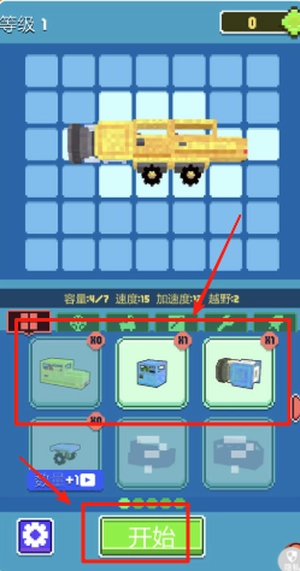 1、开局可选择车辆类型和地图关卡,点击屏幕各种配件可以自由的组装车辆。