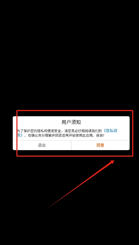 1、屏幕上弹出黑色边框窗口,顶部显示用户须知,需阅读隐私政策后点击橙色同意按钮才能继续游戏。