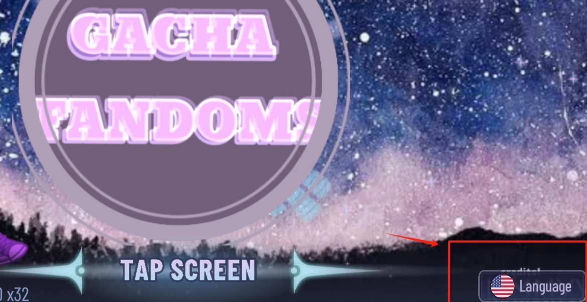 1. 以星空为背景,右上角有一轮月亮。画面中间写着“GACHA FANDOM”。点击左下角或右下角的按钮即可开启游戏,同时还能够选择语言。