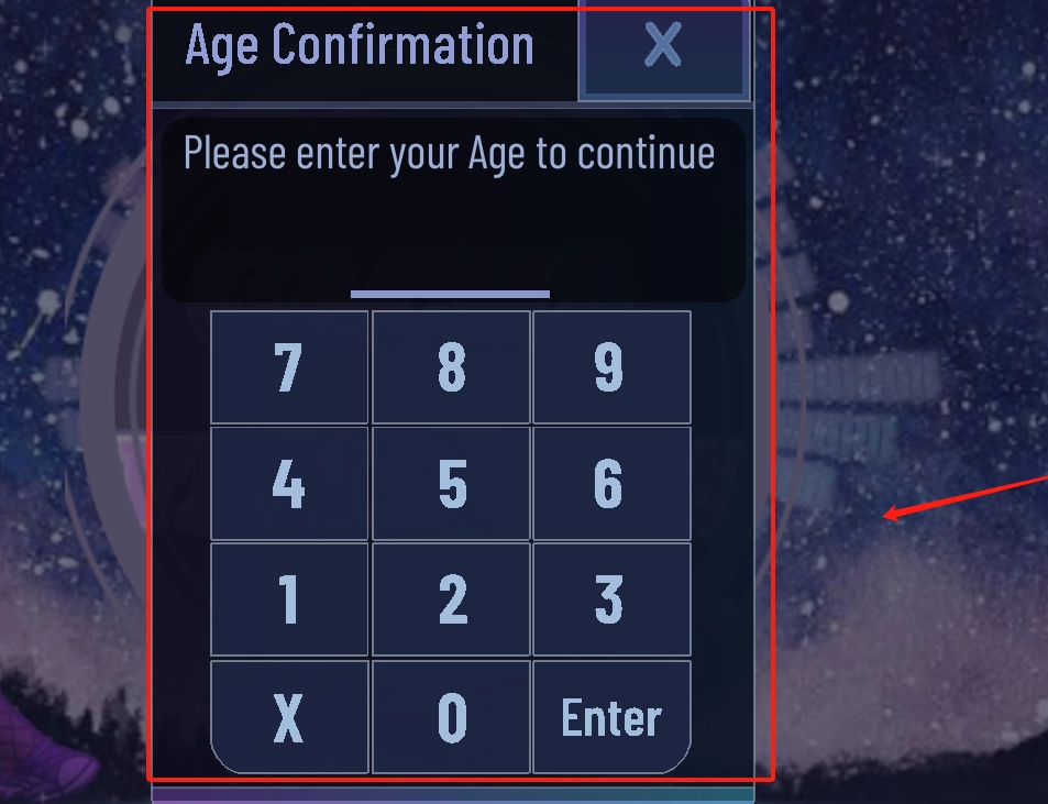 2、此为年龄确认窗口,需先输入年龄方可进入游戏。使用下方数字键盘输入数字,输入完毕后点击Enter键即可。若不想玩,点击右上角的X。