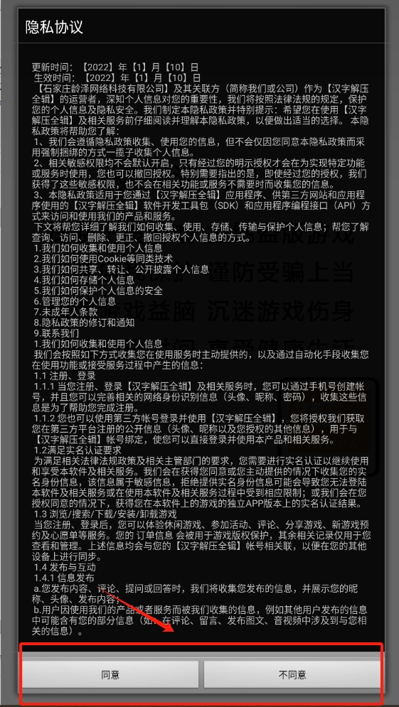 1、点击同意进入游戏,或点不同意退出隐私协议界面。