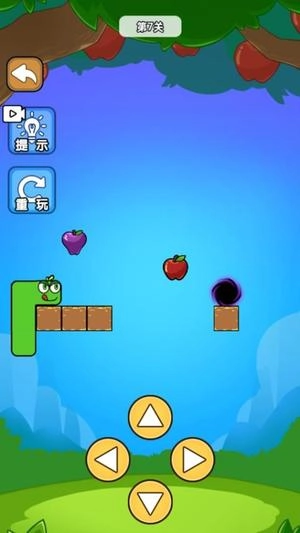 2、借助下方的方向按键操控小蛇吃到苹果,进而以不同姿态移动至蓝色的传送门漩涡之中。