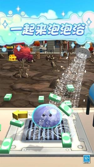 1、玩家从澡堂出发前往各区域清扫,操控史莱姆滚动收集污染物完成指定目标。