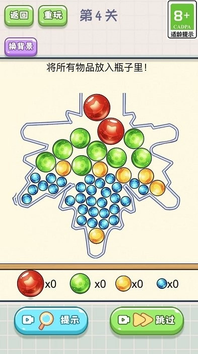 3、成就挑战系统包含“完美填装”“极限空间”等80余项特殊成就,成功完成挑战后,就能解锁稀有球体皮肤以及容器装饰。