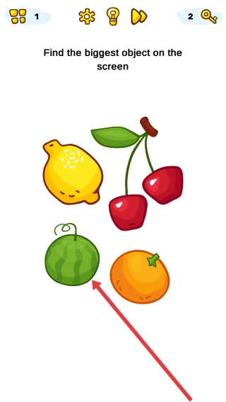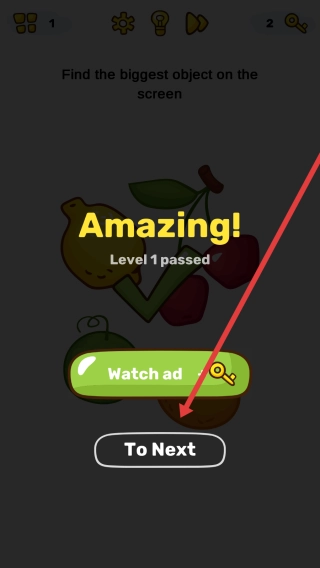 1、第一题“Find-the-biggest-object”,观察水果,通过点击西瓜(最大),完成Level1。