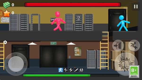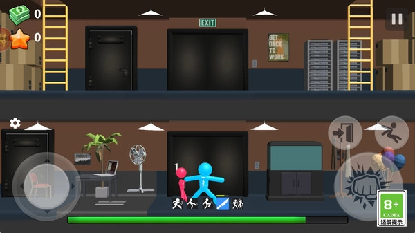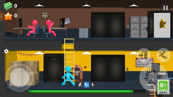 1通过操作虚拟摇杆,来操控火柴人自如移动,让它能攀爬梯子、穿梭房间,逐步靠近敌人,待时机成熟,轻点攻击键实施暗杀,神不知鬼不觉地将对手解决掉。