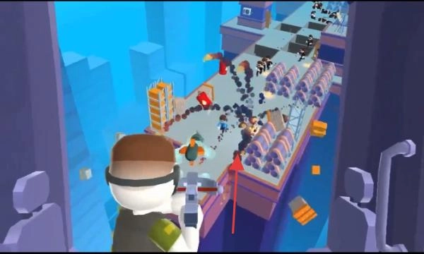 1、射击突围操控戴VR装备的角色,用枪械射击道路上的敌人(黑色群体),清理通道,向直升机方向推进。