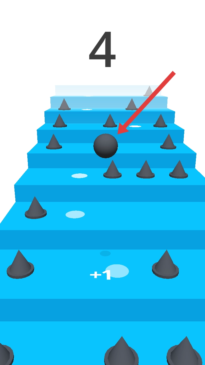 2、游戏中适时点击屏幕操控黑色球体在蓝色阶梯跳跃,避开尖刺陷阱,沿阶梯向上攀爬,上方数字显示当前层级进度。