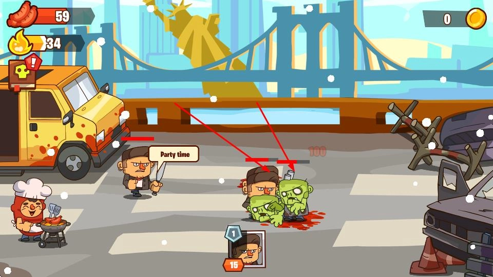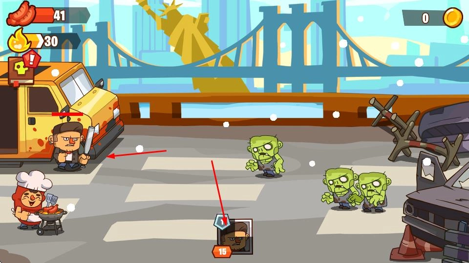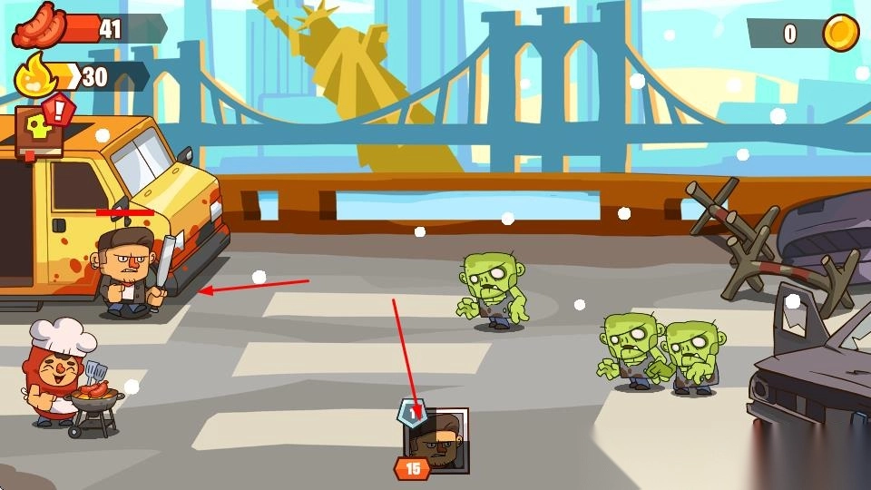 1、在街头场景,点击部署角色,移动至僵尸路径,自动攻击,清理僵尸潮。