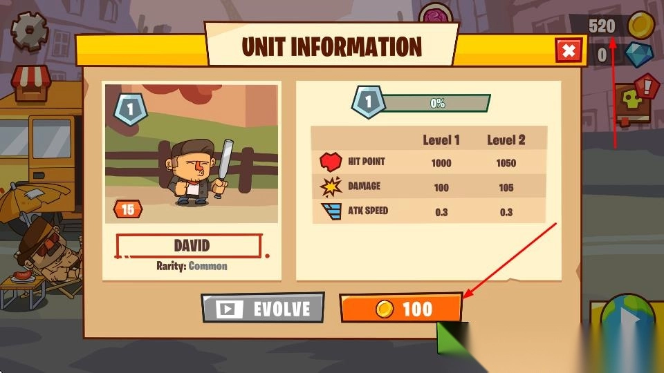 3、战后进入养成界面,消耗金币升级角色,提升血量、伤害、攻速,备战新关卡。