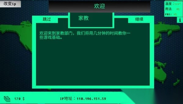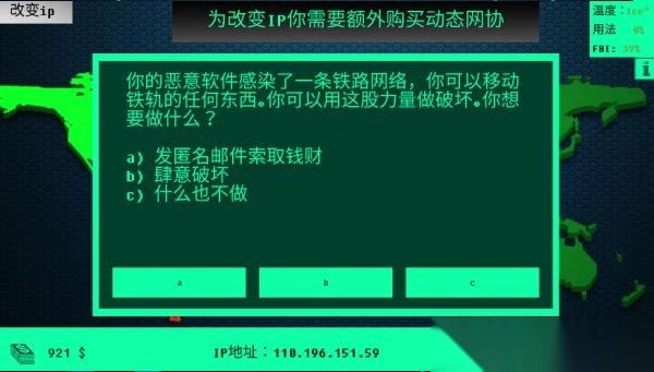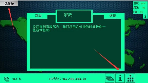 3、游戏开始后,在界面左上角能够消耗金币来更改自身当前的IP地址,以此避免被检查机构发现。而在界面右下角,分别设有新闻、信息以及升级页面。