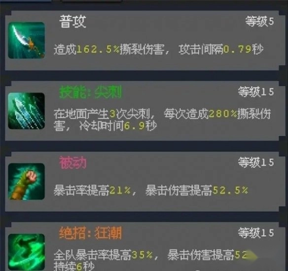 后期作为核心清怪的角色,其绝招“巨骷毒环”务必点满,以此达成全屏持续伤害的效果。