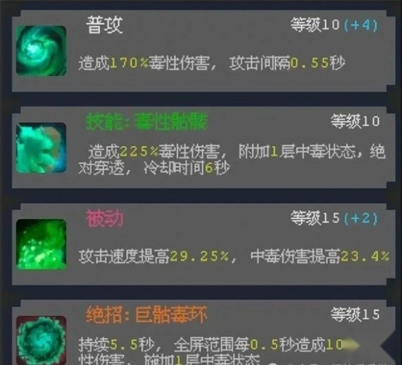 技能提升中毒层数,被动技能优先升级以提升中毒伤害。