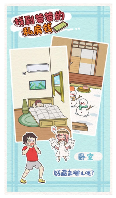 《找到爸爸的私房钱》免费版,开启趣味解谜全新体验!即刻化身小小侦探,穿梭于精心布置的房间,探寻隐匿线索。Q萌可爱的画风,搭配极度烧脑的谜题,全方位考验你的观察力与逻辑思维能力。从寻常的日常物品,到鲜为人知的隐秘角落,随着剧情不断深入推进,更多精彩关卡与趣味道具等你解锁。别再犹豫,快来开启这场充满惊喜与欢乐的寻宝大冒险吧!