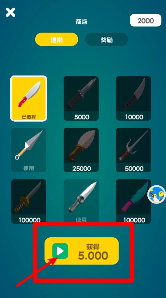 2.刀具选择界面:在商城中使用金币解锁各种不同形状的刀具,或点击按钮观看广告获得奖励。