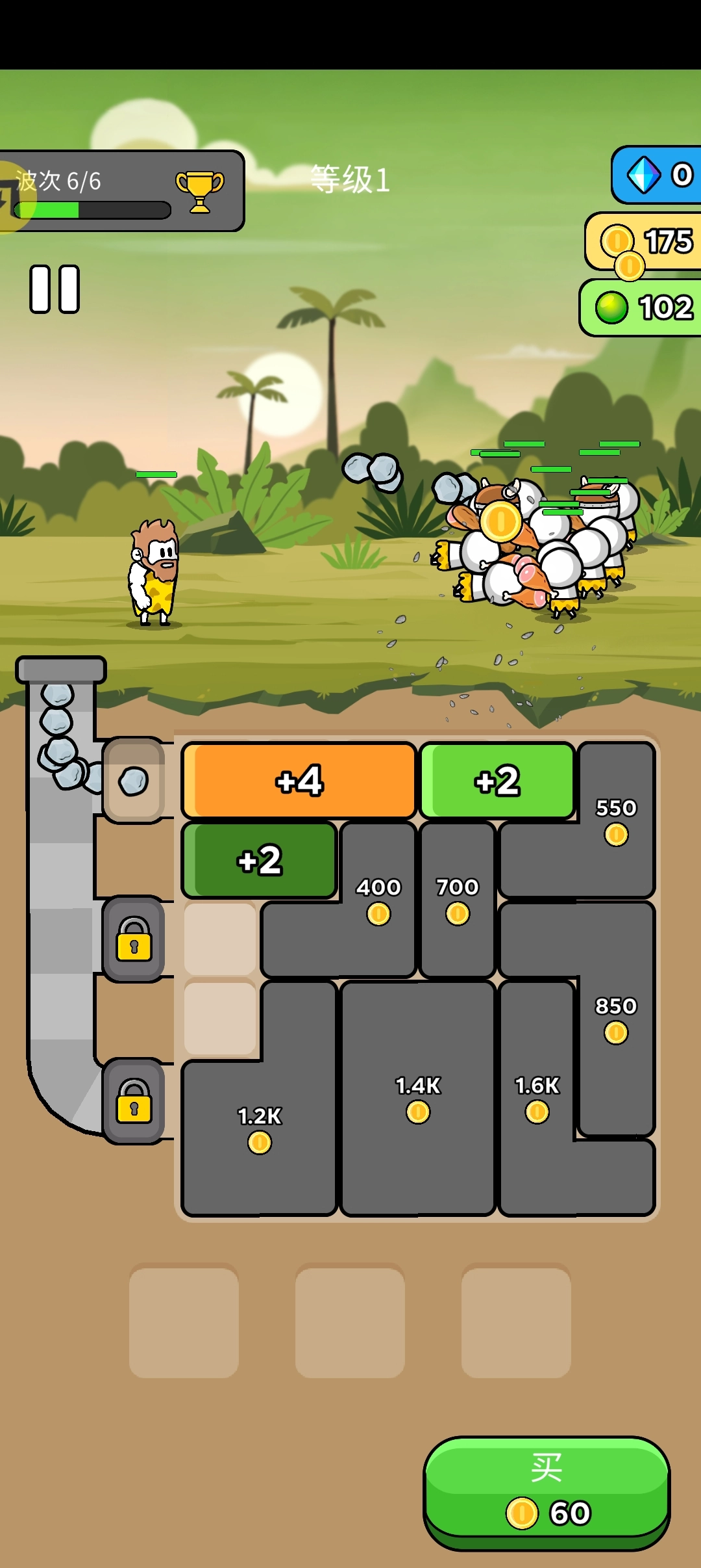 1、原始冲突的玩法极具创意,玩家进入游戏后,首要任务是控制角色,通过将方块与武器合并来增强火力。